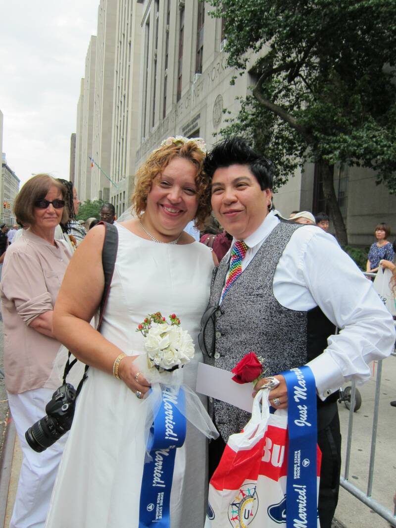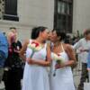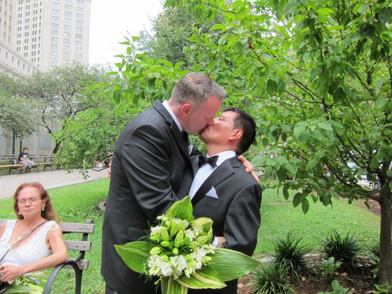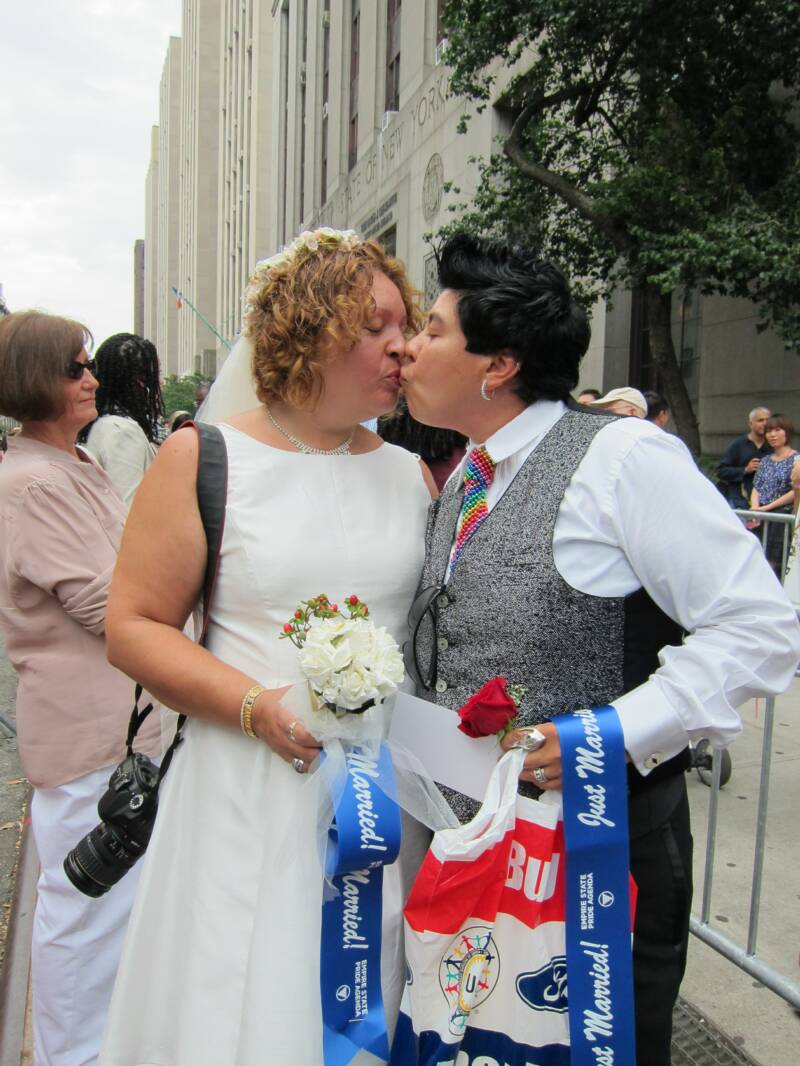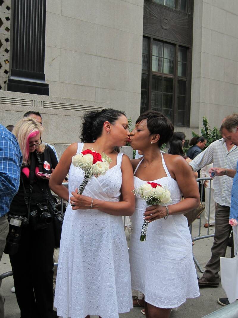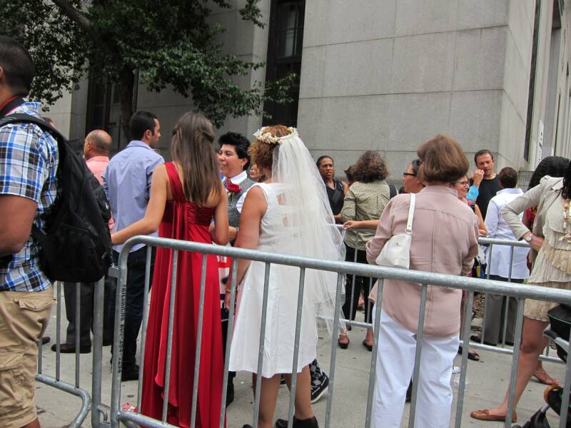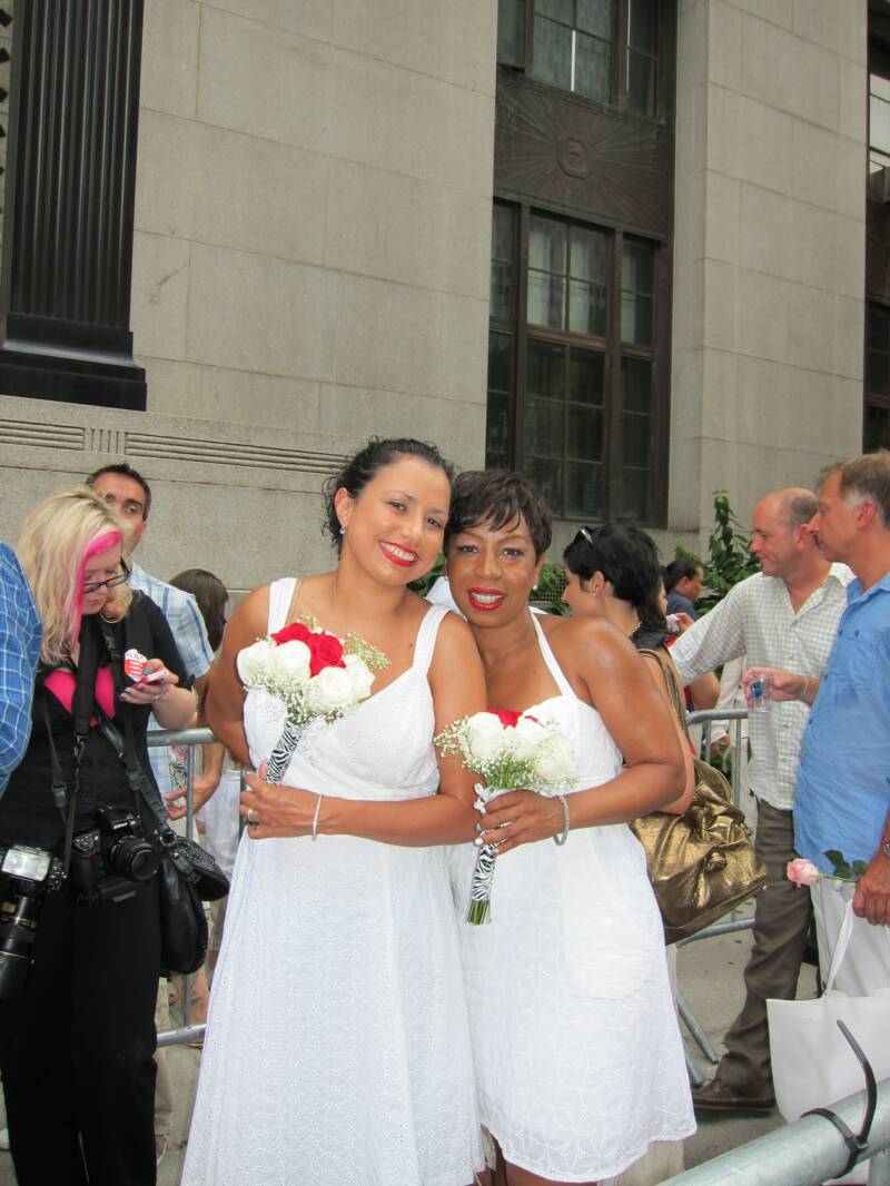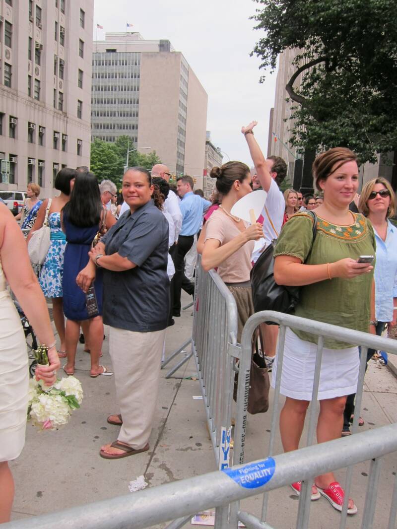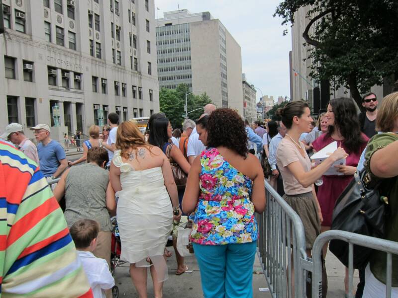 To the best of my knowledge, 484 couples were married and 175 received marriage licenses in NYC on this historic day. I was fortunate to spend Sunday, July 24, 2011 on Centre & Worth Streets meeting many of the couples and experiencing their unabashed happiness, excitement and joy as they patiently waited on line to be married or get their marriage license. As each couple who had just gotten their marriage license or gotten married exited the City Clerk's Office, they were greeted by a crowd that gathered to help them celebrate. There was cheering and applause and confetti and there was just so much joy & love in the air and, it was completely glorious.