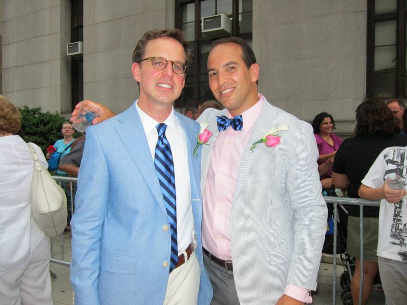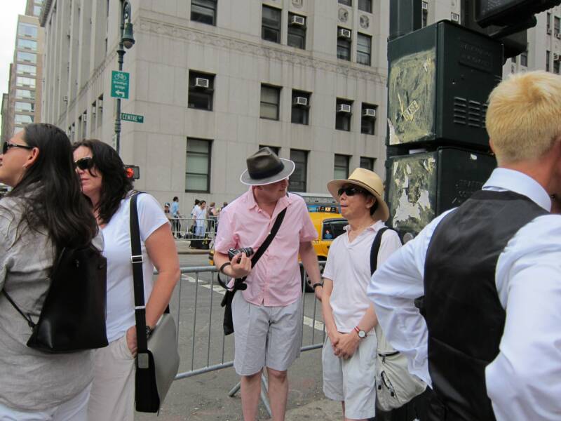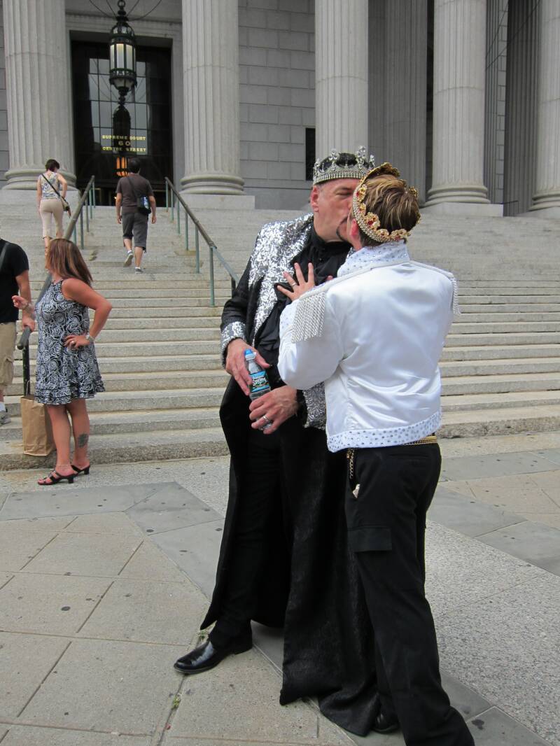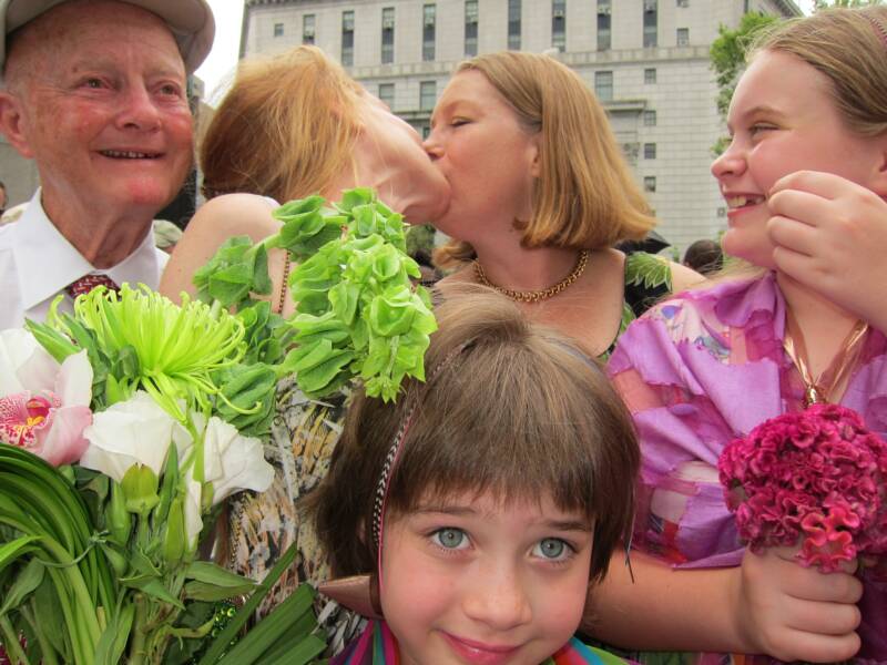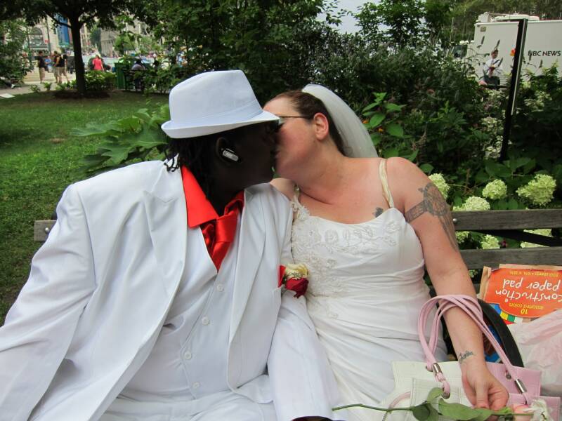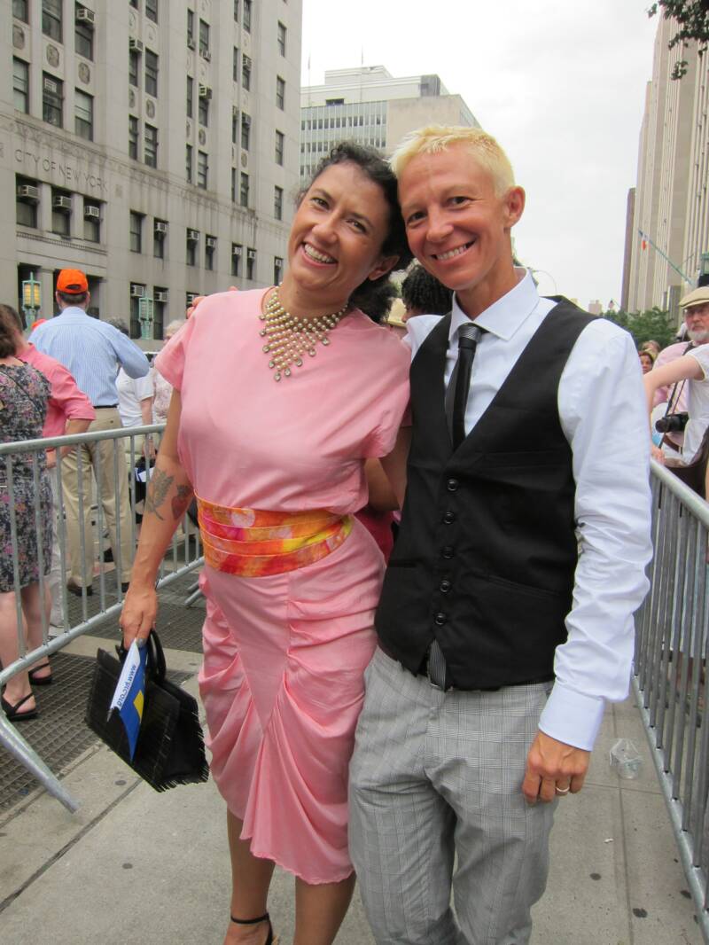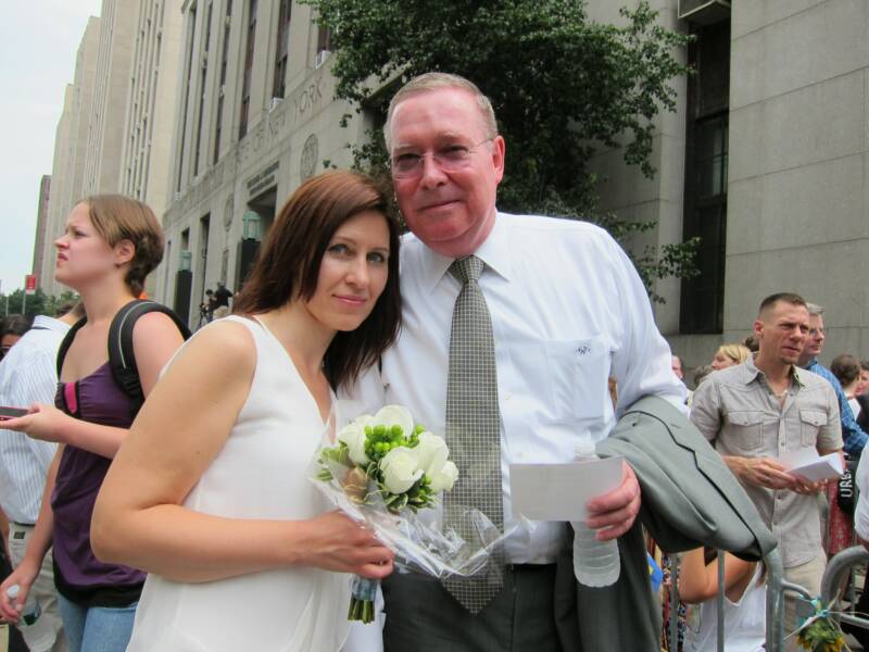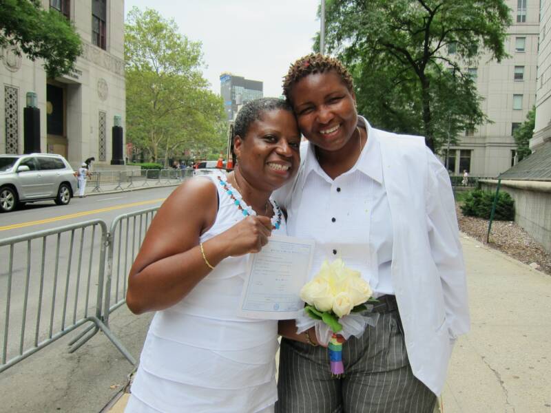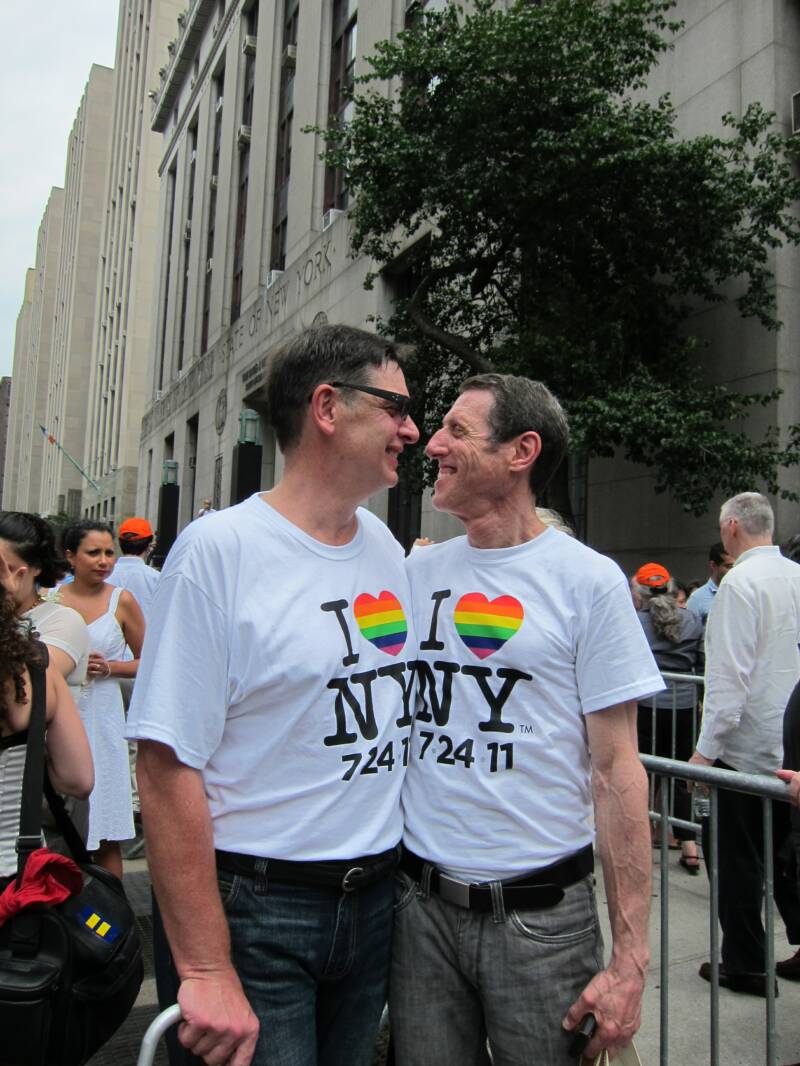 To the best of my knowledge, 484 couples were married and 175 received marriage licenses in NYC on this historic day. I was fortunate to spend Sunday, July 24, 2011 on Centre & Worth Streets meeting many of the couples and experiencing their unabashed happiness, excitement and joy as they patiently waited on line to be married or get their marriage license. As each couple who had just gotten their marriage license or gotten married exited the City Clerk's Office, they were greeted by a crowd that gathered to help them celebrate. There was cheering and applause and confetti and there was just so much joy & love in the air and, it was completely glorious.